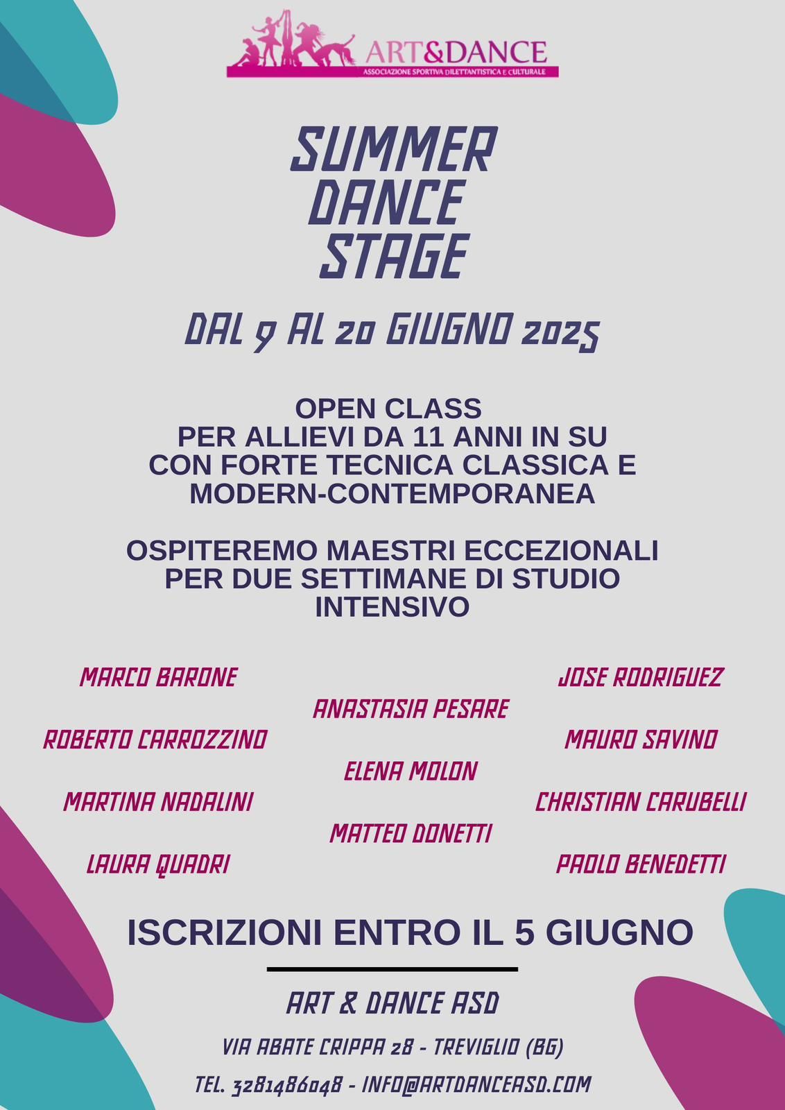 Il summer dance stage nasce con l’obiettivo di offrire agli appassionati di danza un percorso di approfondimento negli stili della danza classica, modern, contemporanea e hip hop.